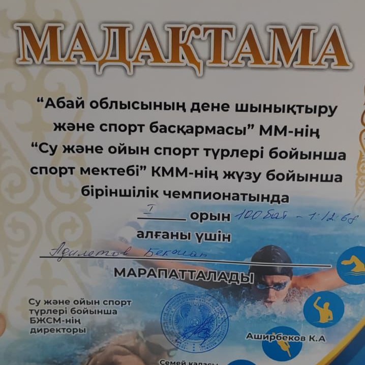 Ученик 7 “Б” класса Адилетов Бекжан занял I место в Открытом первенстве КГУ по плаванию области Абай. Поздравляем! Пусть в твоей жизни будет много таких праздников и заслуженных наград🥳🥳🥳