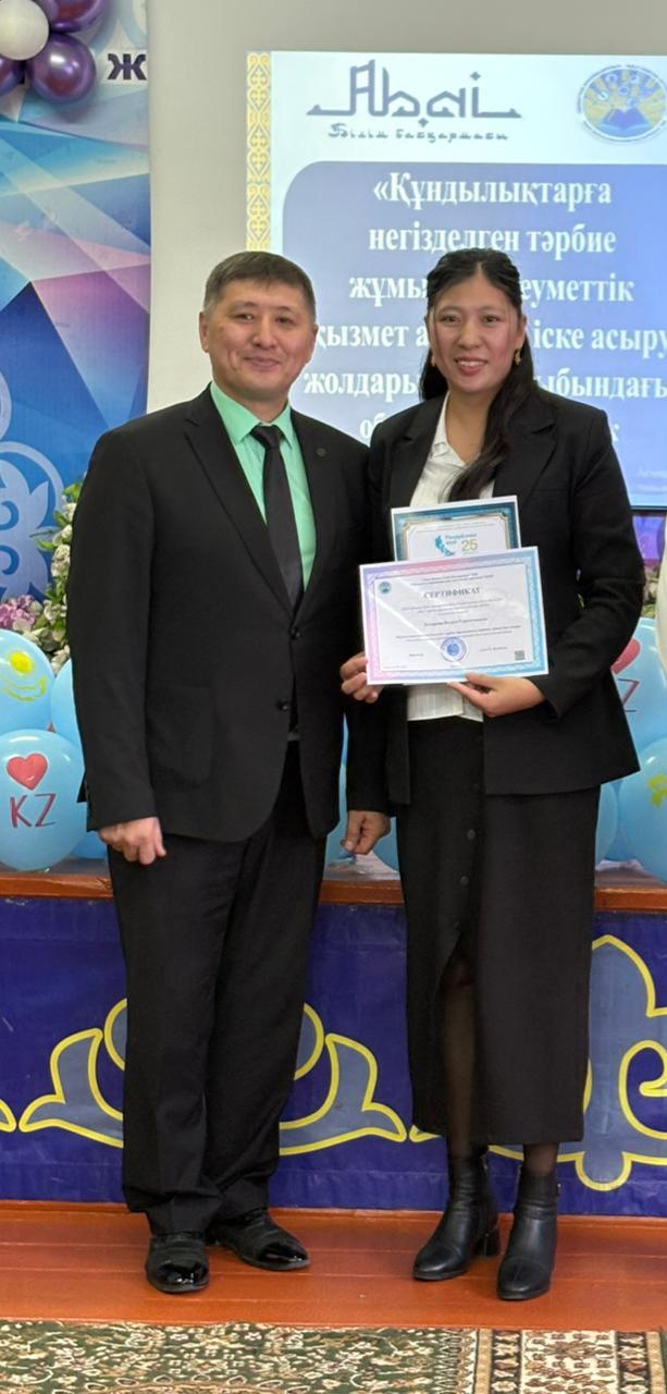 Сонымен қатар, Облыстық инновациялық-әдістемелік орталығы ұйымдастырған “Құндылықтарға негізделген тәрбие жұмысының тиімді іске асыру” тақырыбындағы облыстық семинар-практикумда өз іс-тәжірибесімен бөліскені үшін сертификатпен марапатталды.