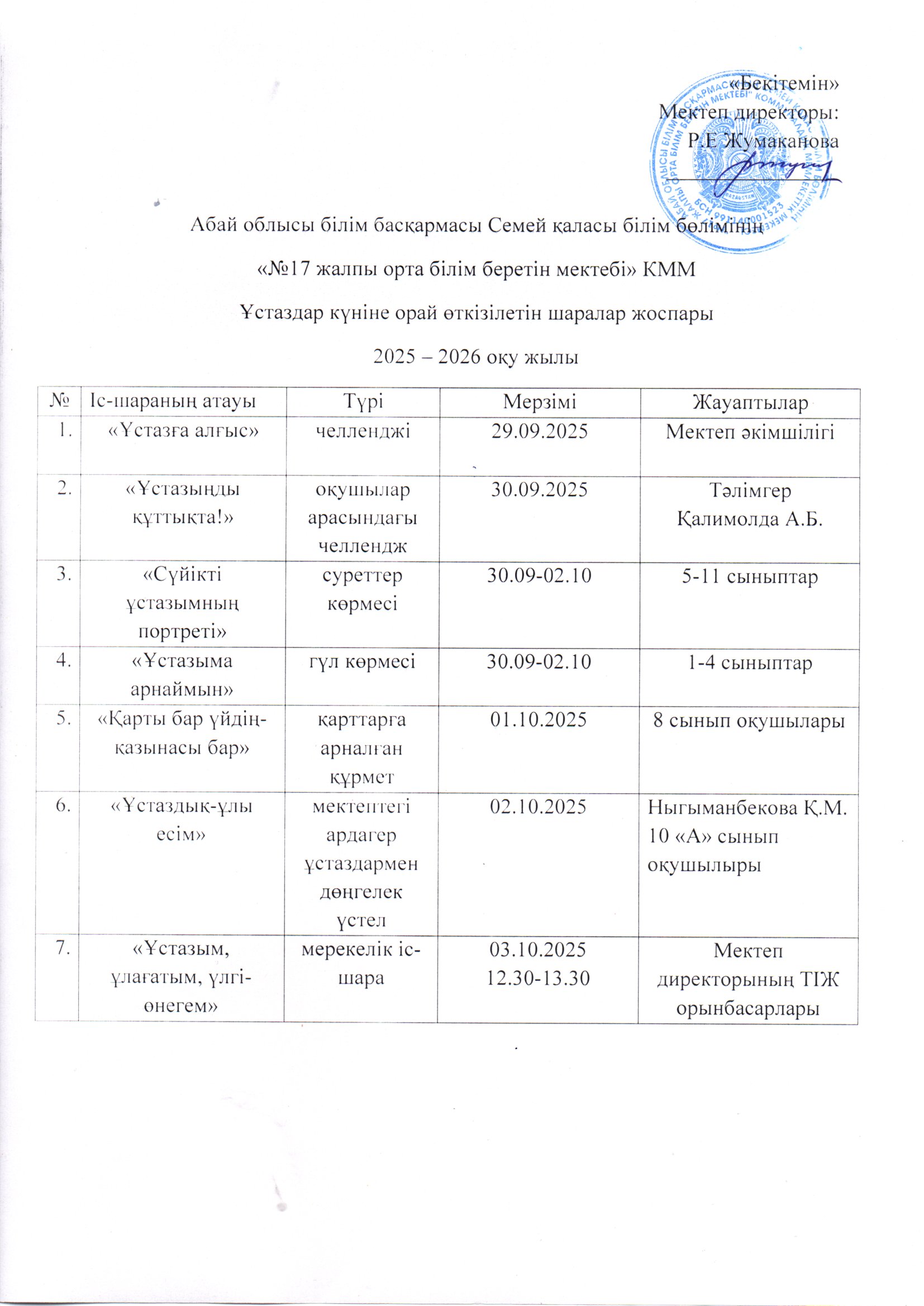 Ұстаздар күніне орай өткізілетін іс-шаралар жоспары » КГУ СОШ № 17
